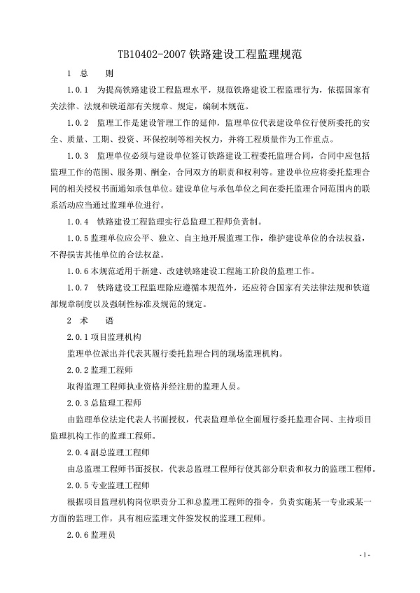 鐵路建設(shè)工程監(jiān)理規(guī)范TB10402-2007